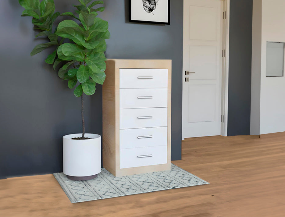 Organiza tu ropa con estilo y practicidad con nuestra cómoda de la colección KIARA. Con cuatro amplios cajones, esta pieza te ofrece espacio de almacenamiento generoso para tus prendas y accesorios, mientras que su diseño en blanco y cambria agrega un toque de elegancia a tu dormitorio.