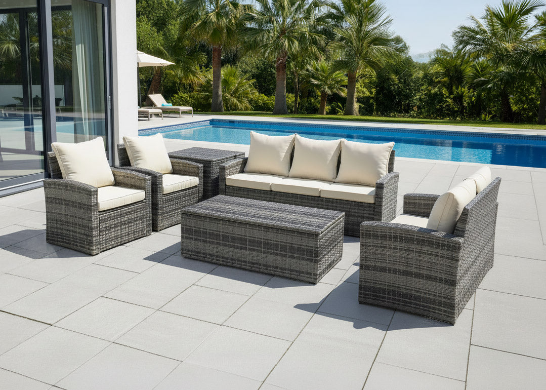 Renueva tu terraza con este conjunto de jardín en ratán PE, diseñado para combinar estilo, confort y orden. Este set incluye 2 sofás y 2 sillones junto a una mesa de centro y un baúl lateral, ambos con un práctico sistema de almacenamiento de elevación automática para proteger tus cojines de la intemperie. Su estructura resistente a la humedad y sus acabados modernos lo convierten en la solución definitiva para mantener tu patio siempre impecable. Disfruta de un mobiliario funcional y sofisticado que transforma cualquier espacio exterior en tu oasis personal de descanso. Facil montaje.
