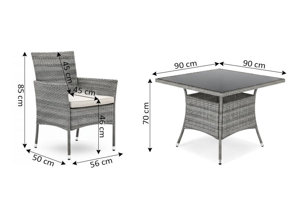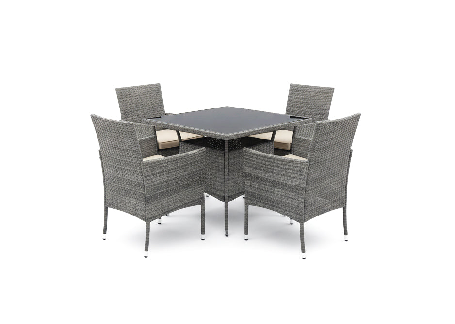 Conjunto de comedor para exterior fabricado en ratán PE resistente a la intemperie. Incluye una mesa cuadrada y cuatro sillas cómodas, ideales para disfrutar de comidas al aire libre con familia y amigos. El ratán sintético garantiza durabilidad y bajo mantenimiento, manteniéndose en perfecto estado durante años. Perfecto para jardines, terrazas y espacios exteriores. Diseño moderno que combina funcionalidad y estética. Facil montaje.